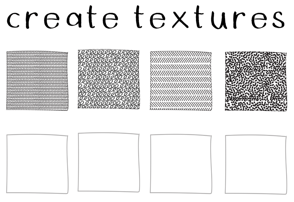 Look at the boxes below. Draw out your own boxes and try to create different textures inside the boxes. Can you create a smooth texture? A rough texture? A bumpy texture? What other textures can you create?