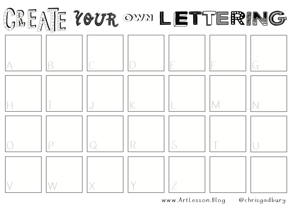 Print out the template. If you don’t have a printer, don’t worry. Today we are designing our own lettering. You can either make them all look similar (all your letters) like they belong to the same family OR you can have fun and think of as many different styles for each letter.