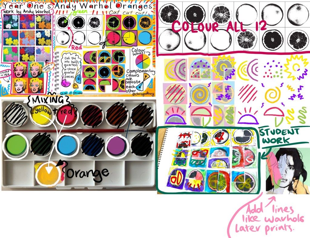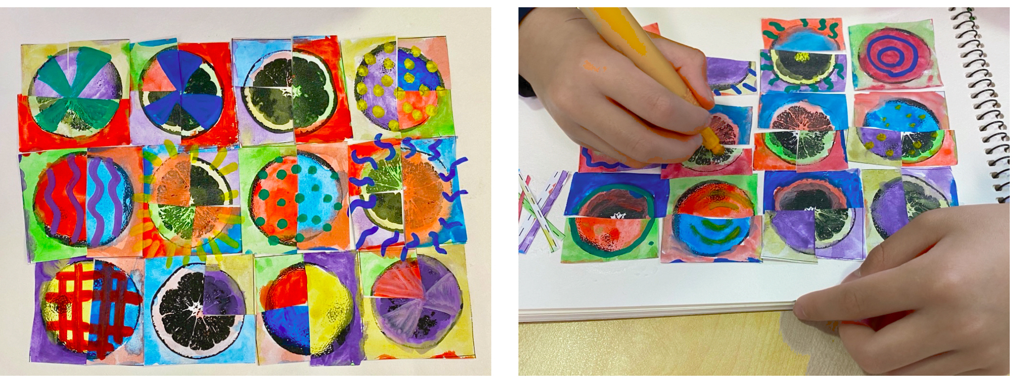 These brightly coloured oranges were painted by in January this year (2020) by our super talented Year One students. The Year Ones cut out pictures of oranges into wholes, halves and quarters a rearranged them. They then painted over them in bright colours and used special paint pens to add dots and lines to give a real Pop Art feel.